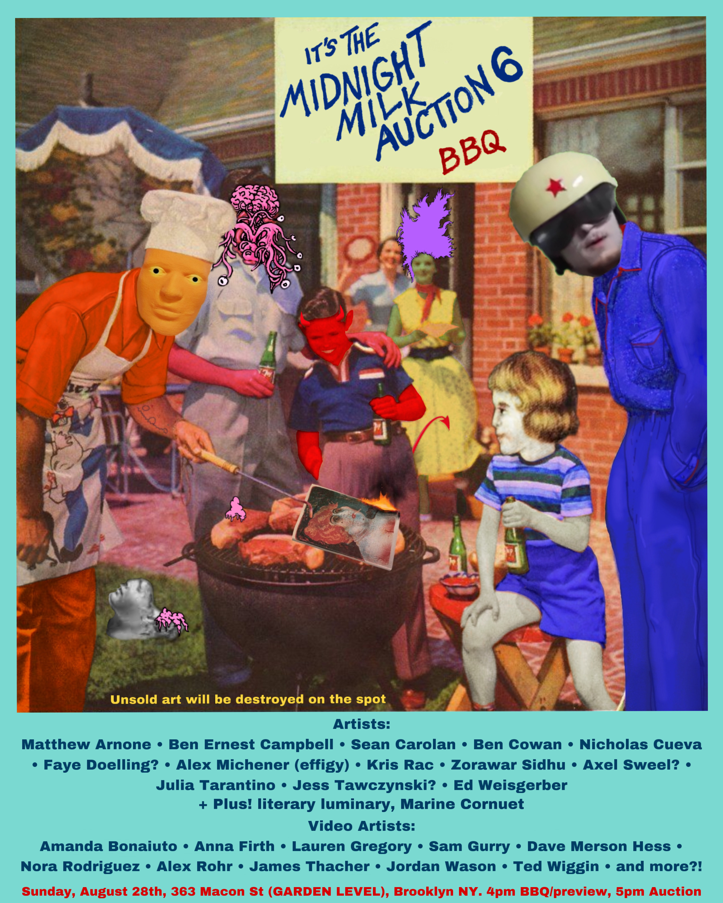 Absurdism, alex michener, Alex Rohr, Alex Sewell, Amanda Bonaiuto, Animation, Anna Firth, Art Auction, artist interview, Auction House, BBQ, Ben Cowan, Ben Ernest Campbell, christies, contemporary art, Dave Merson Hess, DIY, drawing, Ed Weisgerber, Edwin Rostron, Faye Doelling, Film Screening, fluxus, game show, Grill Master, Happening, house show, improv, James Thacher, Jess Tawczynski, jordan wason, Julia Tarantino, Kris Rac, late night, Lauren Gregory, live music, Marine Cornuet, Matthew Arnone, Midnight Milk Auction, Midnight Milk Auction 6 BBQ, Midnight Milk Show, new york city, Nicholas Cueva, Nora Rodriguez, painting, Sam Gurry, scifi, Sculpture, Sean Carolan, Surrealism, talk show, Ted Wiggin, Zorawar Sidhu