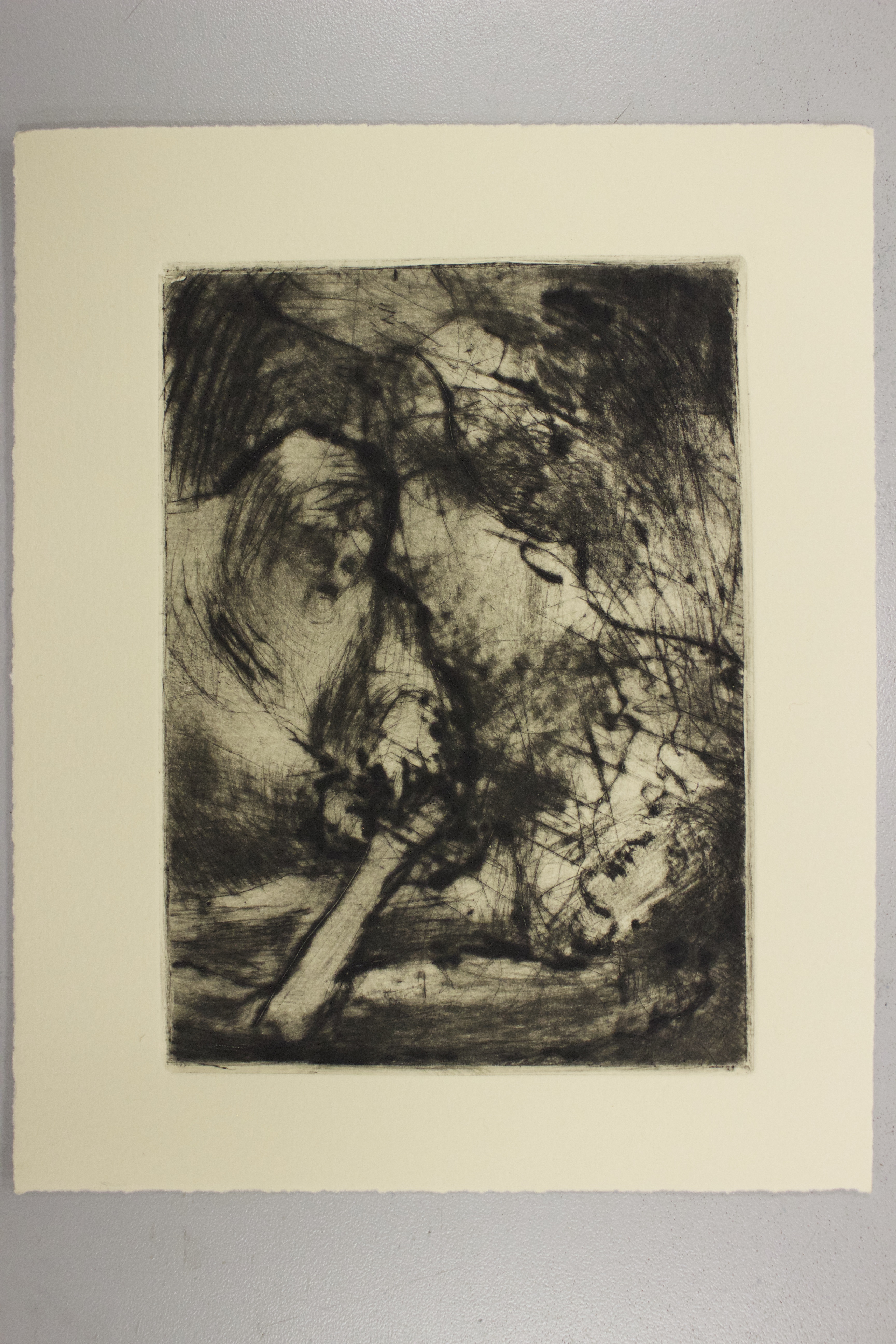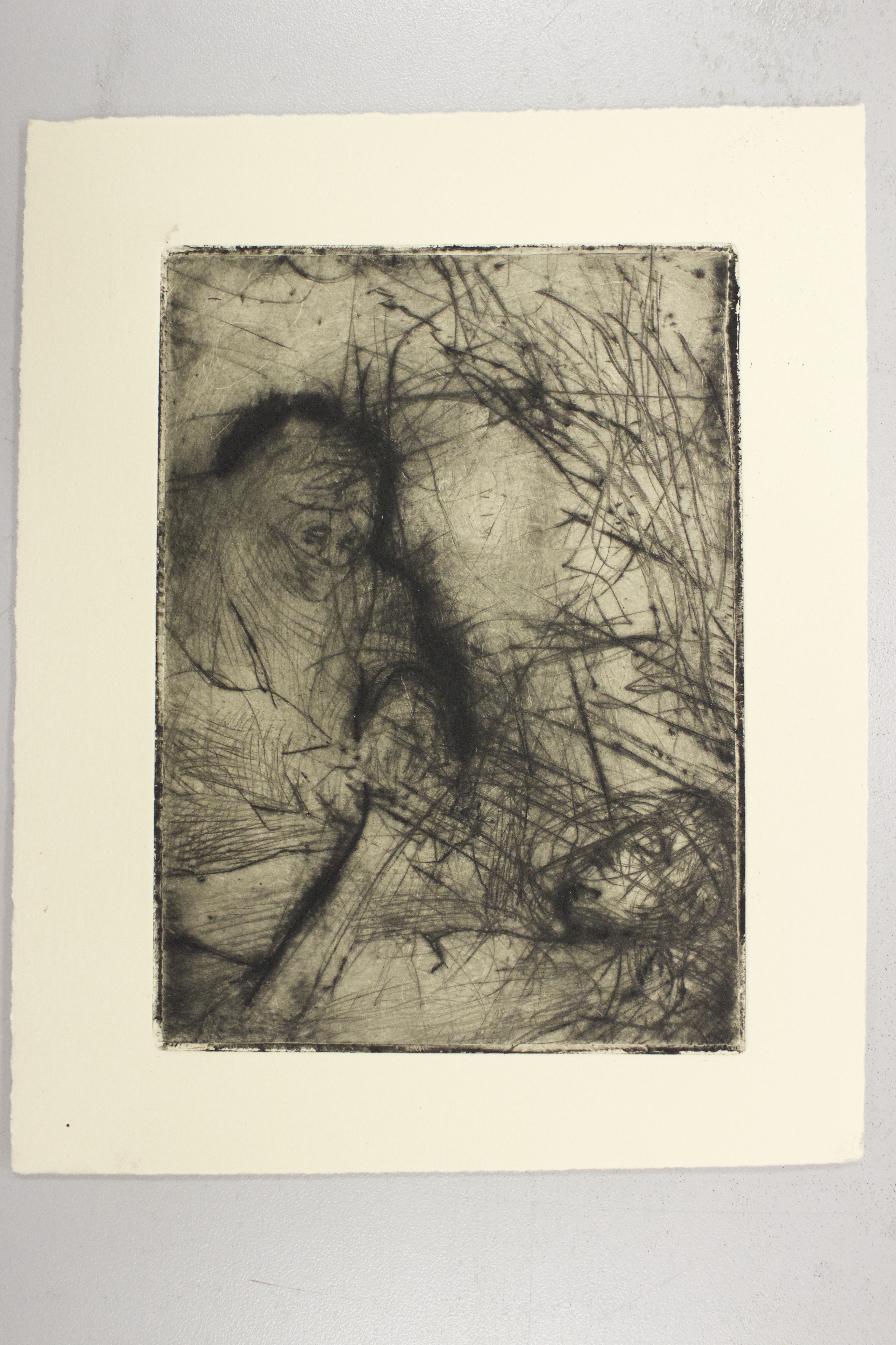 These drypoint etchings are in response to the animation work I was doing with “She Plants a Head”. They depict a mother Mary type figure solemnly grieving over my decapitated body. This figure allows for a triple meaning, inserting religion from Mother Mary, the personal because my mother’s name is Mary, and the political because she does not look out of place in a shawl that relates her to current events. The medium and the way the figures are rendered relates it to Goya’s disasters of war, and the title is largely directed towards him. For these prints no two are the same, they were all either altered by additional drypoint marks or by a different wiping process, creating six unique images.